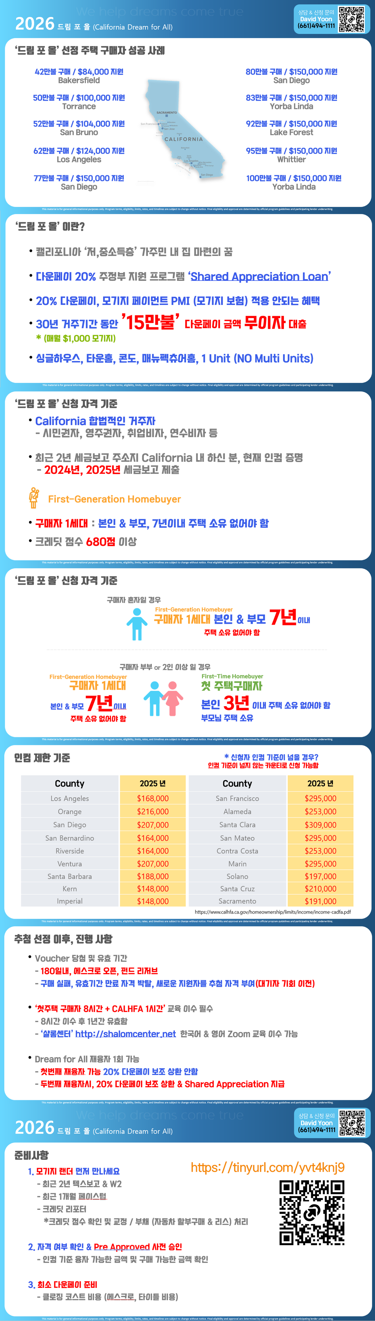 - 카운티 소득 기준 이하 (LA: $168K / OC: $216K / SD: $207K)