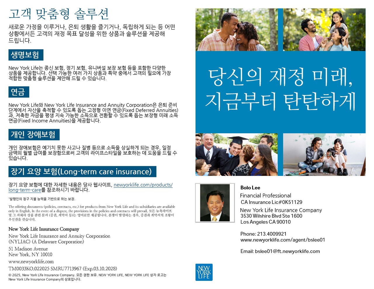 뉴욕 라이프(New York Life)의 전문적인 플랫폼을 통해 고객님과 가족에게 가장 적합한 재정 프로그램을 안내해 드릴 수 있습니다.