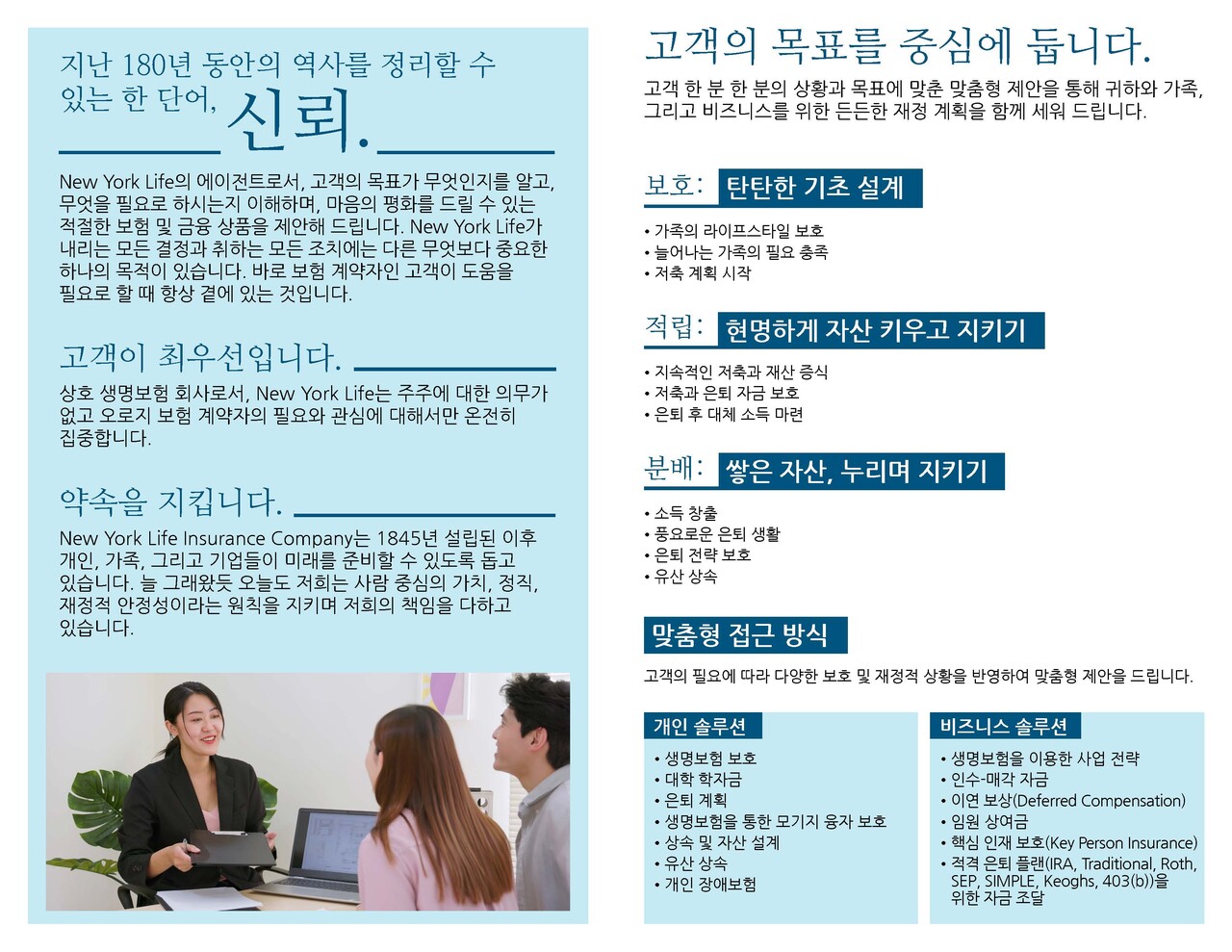 고객님의 미래와 자산 보호, 상속 및 은퇴 플랜에 도움이 될 수 있도록 함께하겠습니다.