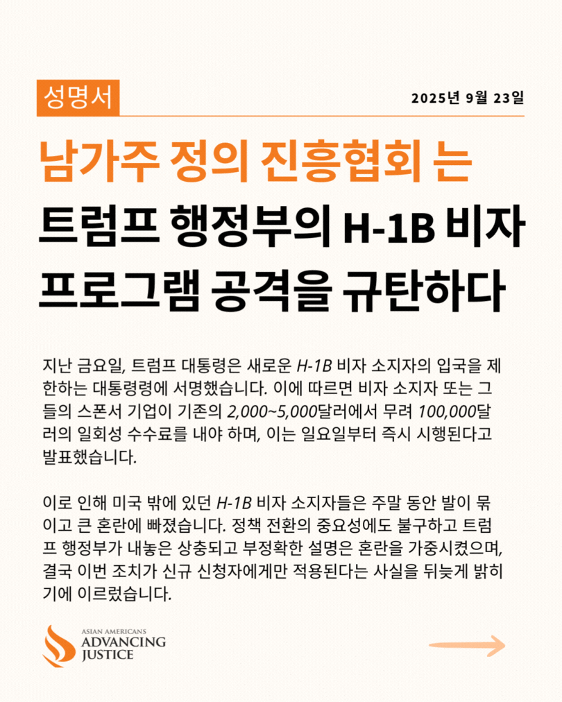 우리는 행정부가 이민자와 우리 공동체를 위한 진정한 해결책에 집중하고, 혼란을 초래하거나 이민 제도를 ‘돈을 내야만 참여할 수 있는 제도’로 만드는 일을 중단할 것을 촉구합니다.